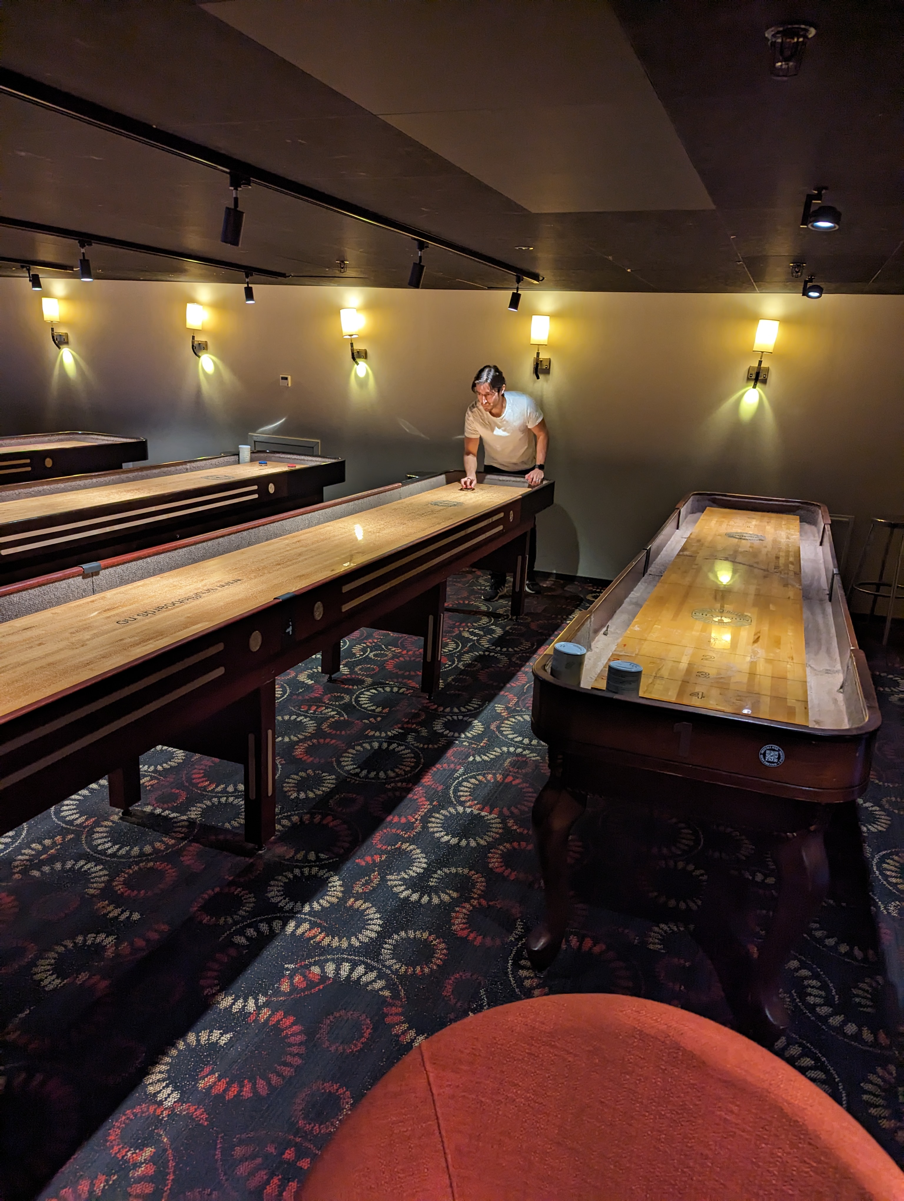 shuffleboard Now it was time for shuffleboard. It was an even battle where everyone had a chance to win.